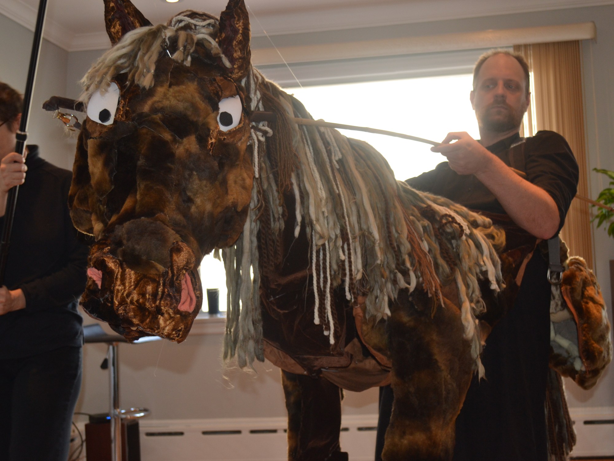 Like many valiant souls throughout history about to head off to war, we were actually convinced that it would all be over within the span of a few days! Of course, at a very superficial level, “that would have been nice.” Looking back, the thought of a hand puppet for close-ups still has—and I realize saying this may well raise the ire of those who specialize in that type of puppet—a quaint charm. On the other hand, the idea of the horse being ridden around with stiff front legs (since the rider’s legs would actually be the horse’s rear legs) most definitely does not. A modified two-person “costume puppet” would certainly have been amusing (I invite you to search for some examples on YouTube), but it also would demanded considerable coordination of movements, and the individual “supporting the rear” would have necessarily had very limited vision.